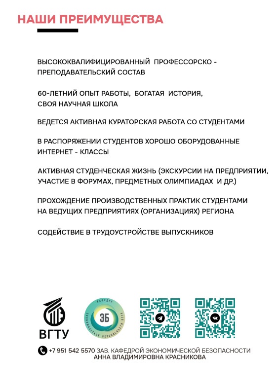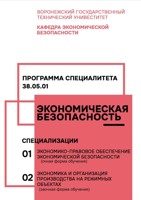 Кафедра экономической безопасности – это уникальное структурное подразделение Воронежского государственного технического университета, осуществляющее подготовку специалистов в области экономики, управления предприятием и экономической безопасности, а ее профессорско-преподавательский состав объединяет в себе как профессиональных преподавателей и ученых, так и специалистов-практиков.