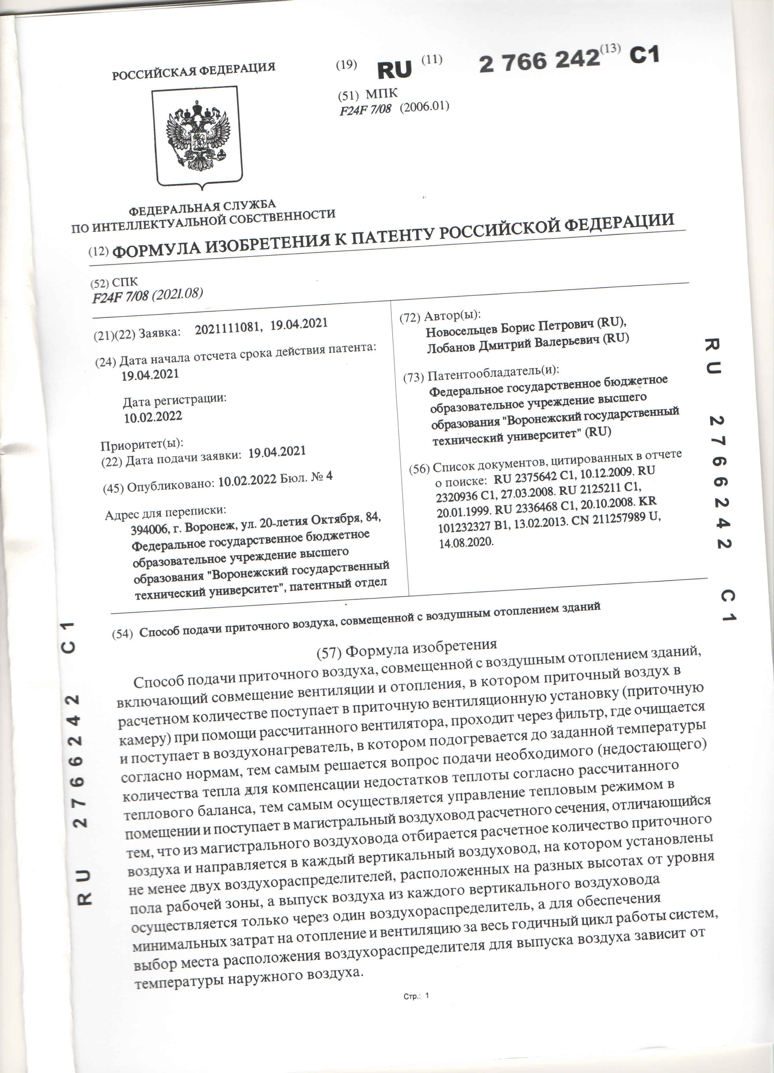 Патент на изобретение №2766242 Способ подачи приточного воздуха, совмещенной с воздушным отоплением зданий