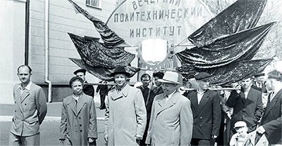 ![]() Первомайская демонстрация сотрудников ВВПИ в 1959 году. В первом ряду справа налево: ректор ВВПИ П.Н. Житков, П.А. Попов, Л.Я. Тарасова, В.Ф. Пушкарев |